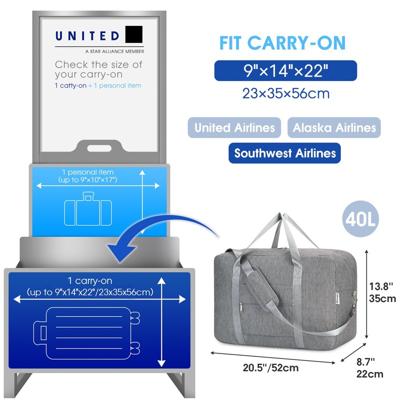 - Fit Carry-on Bag Size - Bag size 20 x 13.3 x 8.7 inch fits carry-on item size 22 x 14 x 9 inch of United Airlines, Southwest Airlines, Alaska Airlines, which could be fitted into the overhead bin