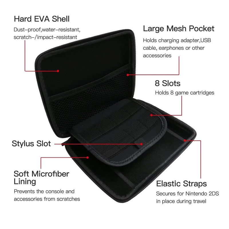 - Compatibility: Hard EVA shell with 8 game card holders protects for 2DS console from accidental bump, drop and scratch. Soft interior protects for 2DS console from everyday wear and tear.