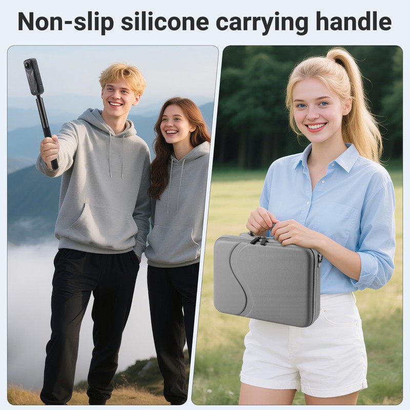 Features a comfortable handle for easy carrying, plus adjustable shoulder straps suitable for crossbody or backpack-style travel. The double zipper mechanism is smooth, durable, and resistant to jamming. Compact yet spacious, it fits Insta360 X4 accessories and is ideal for travel or home storage.
