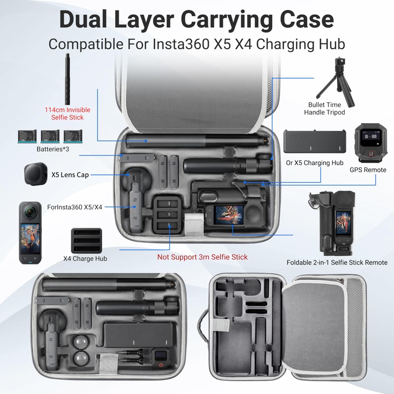 Carrying Case for Insta360 X5 Storage Protective Travel Bag for Insta 360 X5 X4 Basic Bundle Battery Fast Charge Accessories Bullet Time Handle/114CM/Foldable 2 in 1 Selfie Stick/FOMO Power Handle