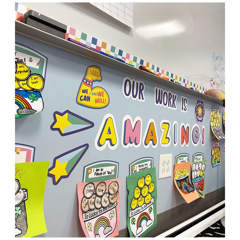 - Inspirational Classroom Décor: Create an eye-catching display to showcase and celebrate your students' hard work and accomplishments with Carson Dellosa’s 45-piece We Stick Together Our Work is Amazing Bulletin Board Set!