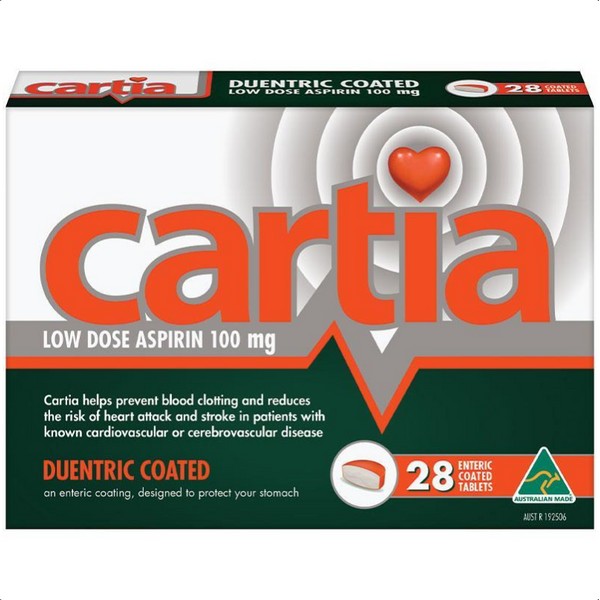 CARTIA helps prevent blood clotting and reduces the risk of heart attack and stroke in patients with known cardiovascular or cerebrovascular disease. For use under medical supervision only. The use of low dose aspirin may be only one component of your medical practitioner’s management plan to prevent you having a further heart attack or stroke. You should discuss this plan with your medical practitioner. Do not substitute other medicines containing aspirin, for this medicine, without first consulting your Pharmacist or medical practitioner.