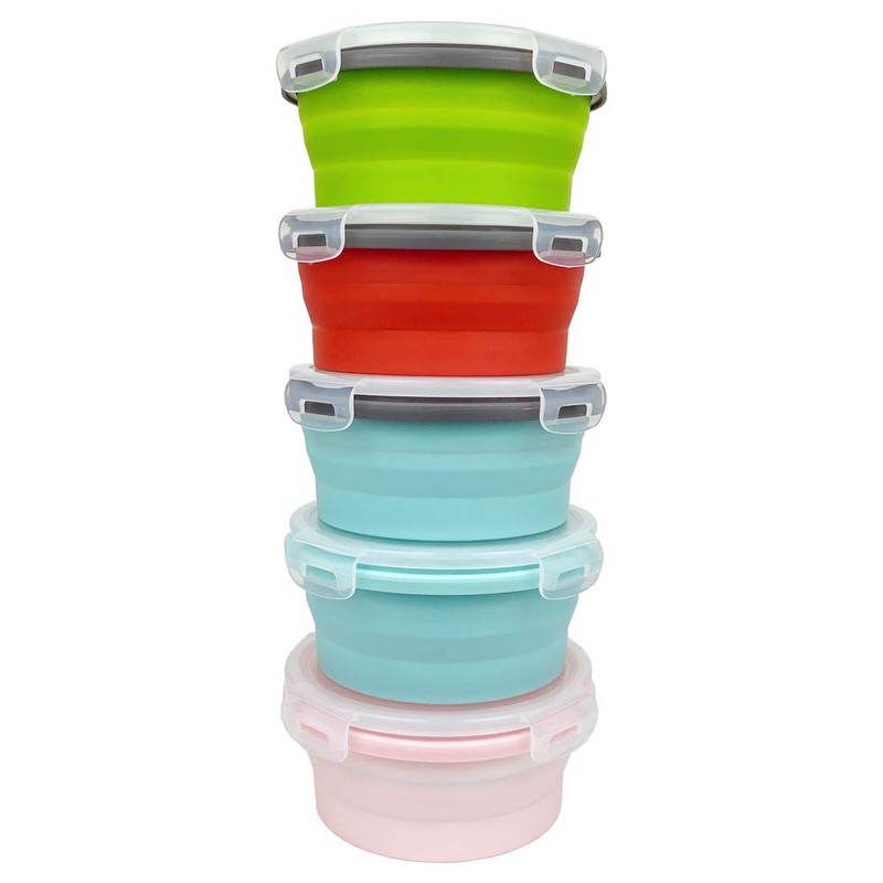 - Keep Food Fresh: Set of 5 assorted collapsible silicone containers. Size - 800ml: 6.5inches*6.5inches*2.8inches. Perfect silicone container bowl set for kids lunch boxes, leftovers, take out or as meal prep container. Each container is great to keep dry or wet foods like cereal, fruits, vegetables, baby foods stay fresh.