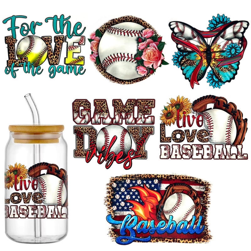 Cartoon Baseball Sports Ball UV DTF Cup Wrap Transfer Stickers for 16oz Glass Cups, Rub on Transfers for Crafts Cup Decal Stickers-6Sheets (D)