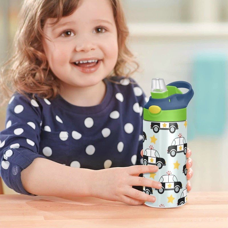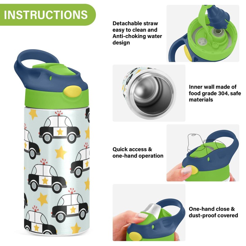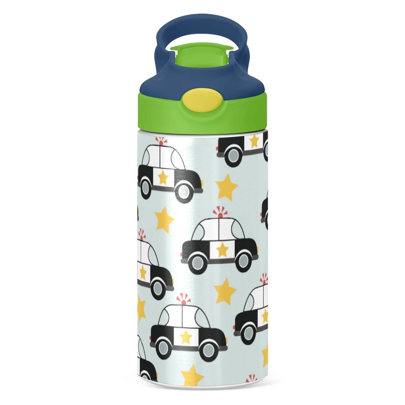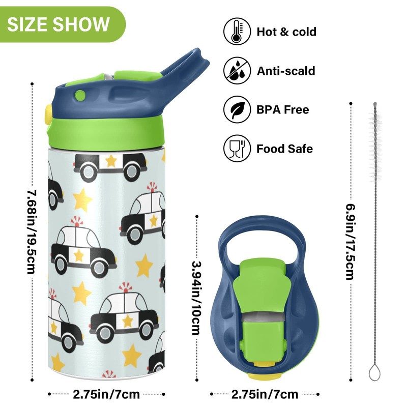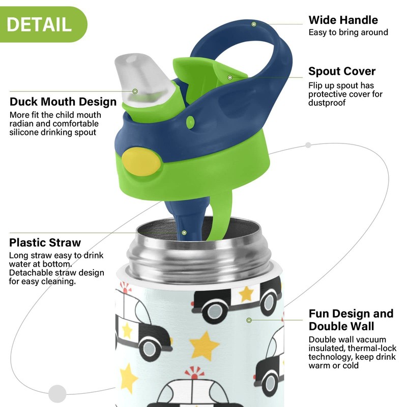 Cartoon Police Car Star Blue Kids Water Bottle with Silicone Straw Insulated Stainless Steel with Straw Lid BPA-Free Duck Mouth Leakproof Flask Tumbler for Girls Boys Toddlers 12 oz