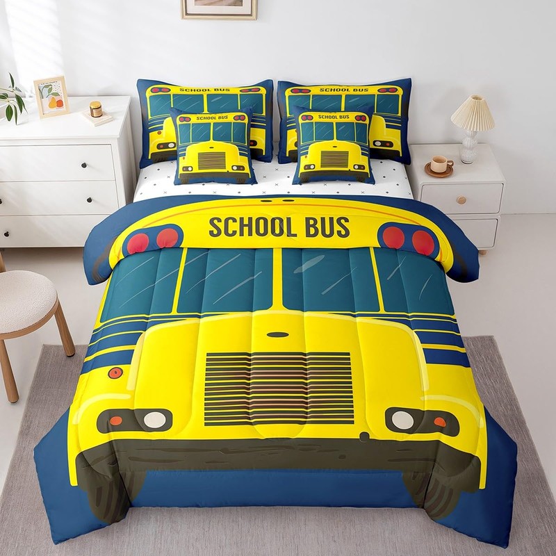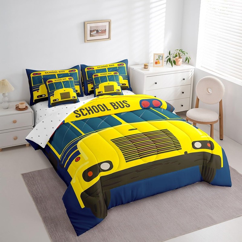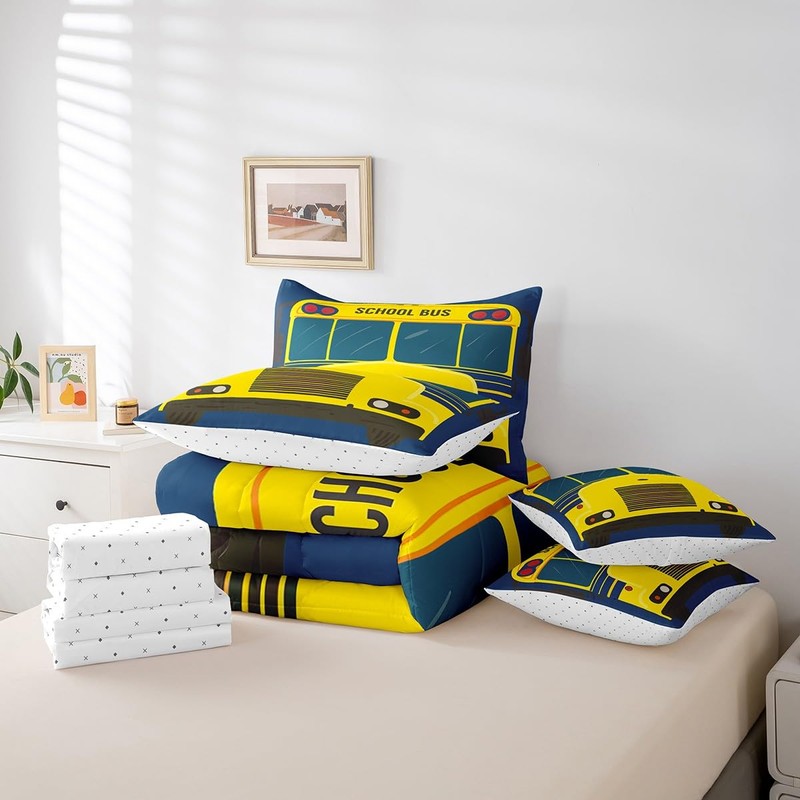 Cartoon School Bus Kids Comforter Set 7 Piece Twin Size,Bright Yellow Car Print Navy Blue Reversible Quilt Set,Vehicle Front Wheels Bedding Set with Comforter,Sheet,Pillowcase