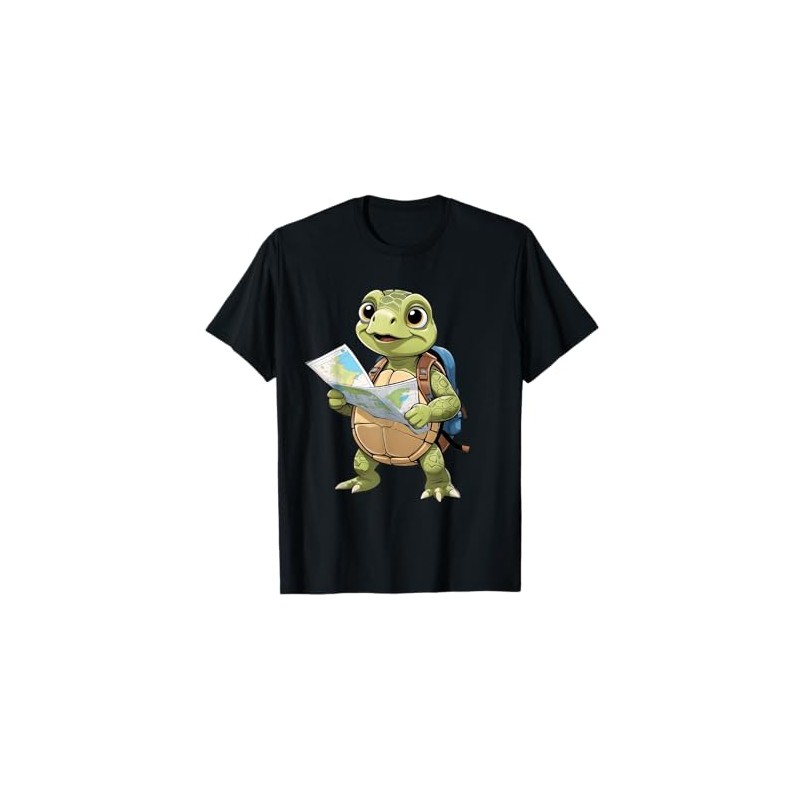 Cartoon Turtle Traveling with Map and Backpack Illustration T-Shirt