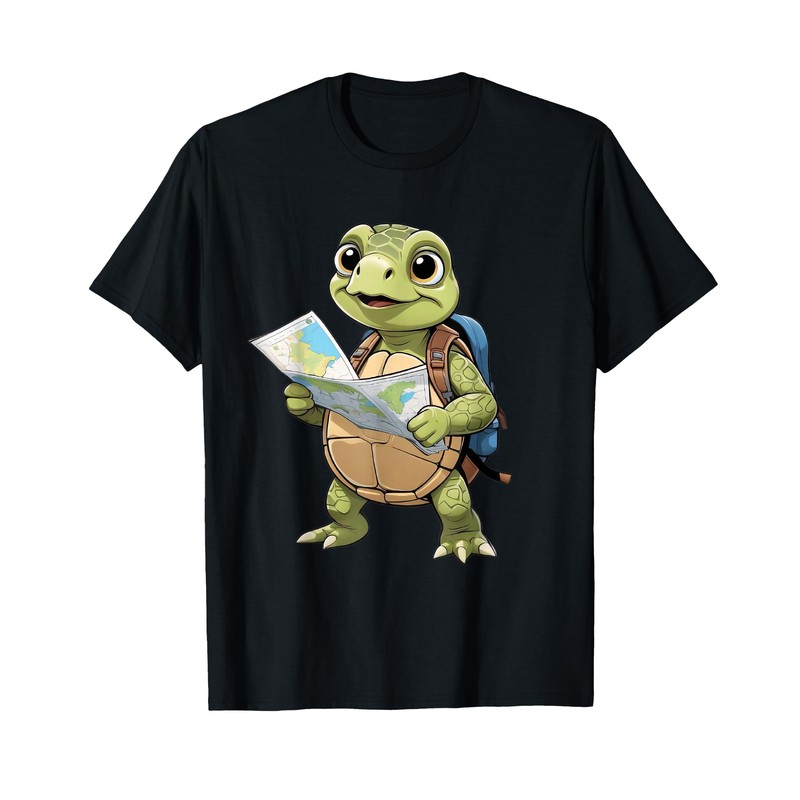 • Cartoon turtle illustration holding a map with backpack – perfect for animal lovers and travel fans.