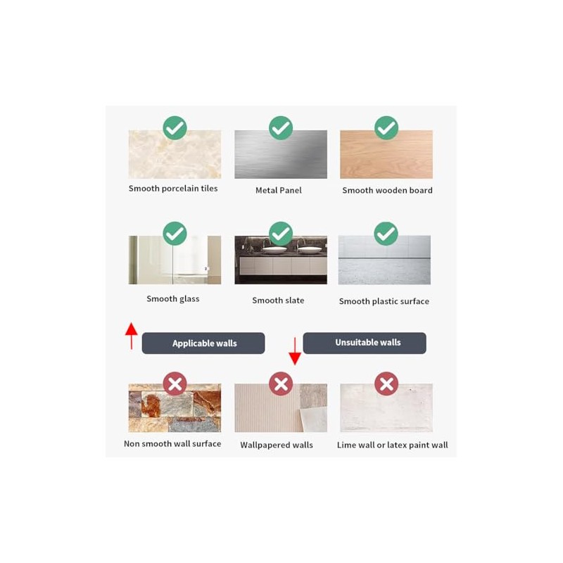 - Stick Only on Smooth Surfaces-Works on non-porous flat walls: tiles/glass/marble/smooth plastics. Not for brick/rough wood/sandy textures/uneven paint. Check surface checklist in images.