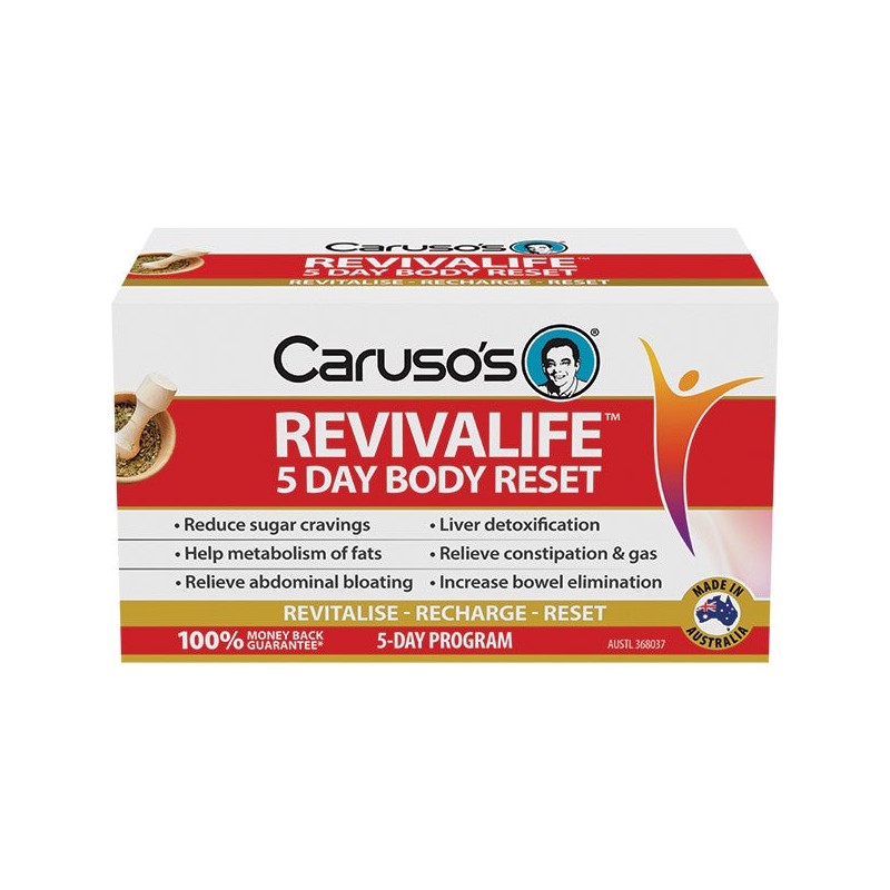 Revitalise - Recharge - Reset Caruso’s Revivalife – Triple Action Body Reset Caruso’s Revivalife 5 Day Body Reset carton includes 3 product formulas Caruso's CraveLESS, Caruso's Fluid Away & Caruso's Bowel Clear containing a total of 16 herbal and nutritional ingredients. When used together in conjunction with the Body Reset Diet (Scan QR code within the carton) they work simultaneously to revitalise, recharge and reset your body. How Caruso’s Revivalife 5 Day Body Reset works 1) Caruso's CraveLESS is a high-quality formula that helps reduce sugar cravings, helps with the metabolism of fats, supports healthy liver function and healthy blood sugar levels. If you have a sweet tooth, overindulge on sweets, and can’t stop, Caruso’s CraveLESS will help you kick your sugar habit. 2) Caruso's Fluid Away is a dual action formula containing dandelion, which is traditionally used in Western Herbal Medicine to temporarily relieve mild fluid retention, abdominal bloating and can aid in the elimination of metabolic waste from your body. 3) Caruso’s Bowel Clear contains a blend of digestive and internal cleansing herbs designed to relieve constipation, symptoms of indigestion, abdominal bloating and excess intestinal gas. It also helps to improve intestinal transit time helping to increase bowel regularity, ease bowel motions and assists with natural body waste elimination. 4) Body Reset Diet QR code is included within the carton. The Body Reset Diet is a nutritional eating plan that is high in fibre, rich in essential fatty acids, vitamins, minerals, amino acids and is low in carbohydrates. The eating plan is designed to take a load off your digestive system, allowing the 3 herbal and nutritional formulas to perform at their maximum potential while providing you with sustained energy throughout the day. Health Benefits Why Use Caruso’s Revivalife 5 Day Body Reset? Caruso's Revivalife 5 Day Body Reset has been formulated to help support the body's natural detoxification processes whilst aiding in the excretion of metabolic waste. Social events, weekend events and parties can often mean poor dietary choices. Caruso's Revivalife 5 Day Body Reset may aid in kick starting a healthier way of life with the help of three products designed to aid effective body waste elimination by supporting liver cleansing, maintaining digestive health and body waste elimination. Caruso’s Revivalife 5 Day Body Reset Has Been Formulated to: Increase bowel waste elimination Promote bowel regularity Relieve constipation Reduce sugar cravings Help metabolise fats Relieve abdominal bloating