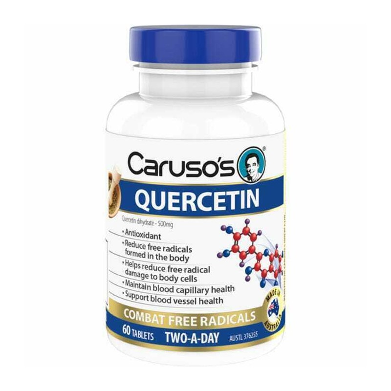 Carusos Quercetin 500mg 60 Tablets. AUST L 376255 Quercetin is a powerful antioxidant which helps to support blood vessel and capillary health, whilst also helping to reduce free radical damage to body cells. Quercetin is a high strength antioxidant found in many plants and foods, such as red wine, onions, green tea, apples and berries. Ingredients. Each tablet contains: Quercetin dihydrate 500mg Directions: Adults take 1 tablet twice daily or as directed by your health professional Warnings: Not recommended for use by children under 18 years Always read the label. Follow directions for use Vitamin supplements should not replace a balanced diet If symptoms persist, talk to your health professional