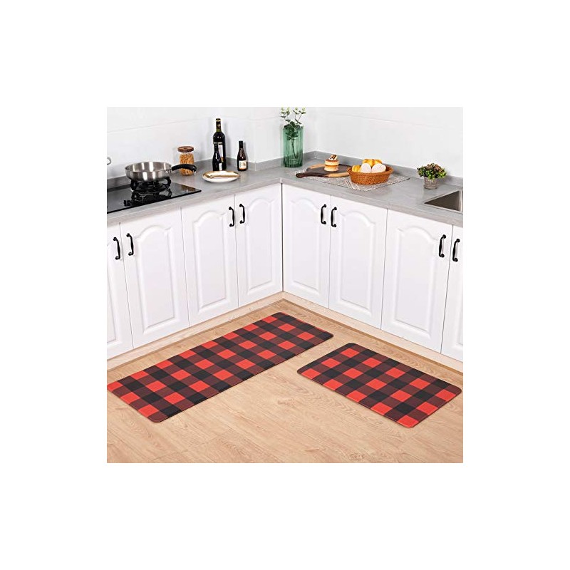 Carvapet Buffalo Plaid Kitchen Mat 2 PCS Cushioned Anti-Fatigue Kitchen Rug Waterproof Non-Slip Mats PVC Ergonomic Comfort Standing Foam Mat for Office Laundry, Black&Red, 17.3''x27.5''+17.3''x47.2''