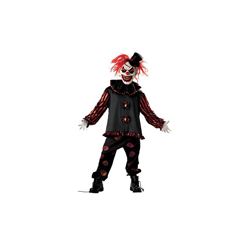 Scary, demented, grinning, evil clown costume includes a long sleeve shirt with red/black sleeves and skull decorations down the front, black elastic waist pants with red screen-printed skull designs, evil mask with attached hair and net for a secure fit, mini top hat with an elastic strap, and neck ruffle. Fits child sizes 12-14. 75% polyester, 10 % EVA, 15% polypropylene. Care instructions: Spot clean only. Air dry. Cool iron if necessary.12-14
