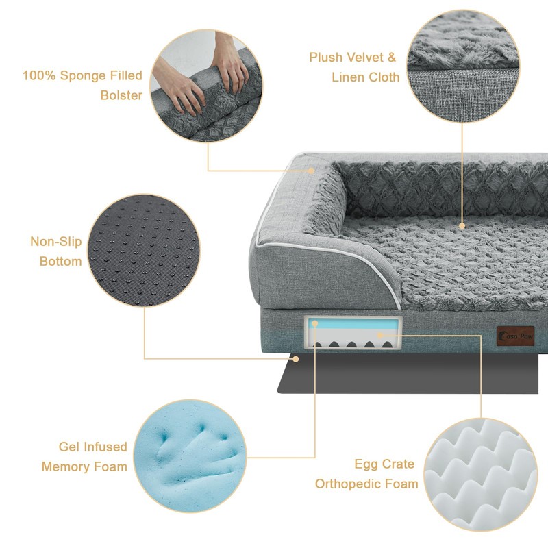 - GEL & EGG CRATE FOAM: Casa Paw orthopedic dog beds adopt a design that combines memory foam and egg crate foam. Gel infused memory foam helps relieve joints pains and heat dispersion, keeping pets relatively cooling in hot summer. Egg crate orthopedic foam helps cushion pressure points and distribute weight evenly, keeping pets warm in cold winter. Our dog beds are suitable for all seasons and totally recommend for elderly dogs with anxiety and dogs with arthritis.