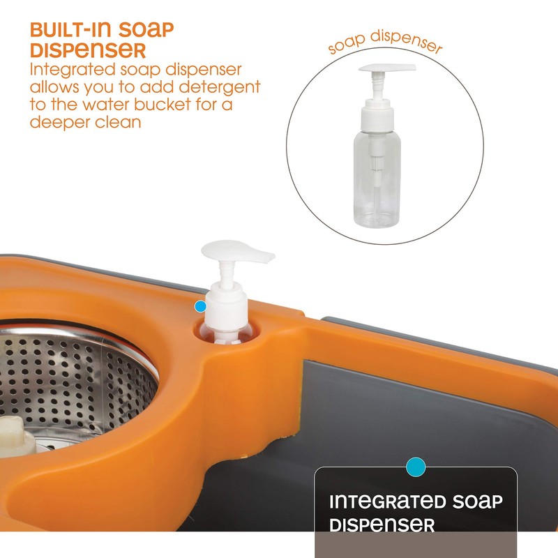 - BUILT-IN SOAP DISPENSER: Integrated soap dispenser allows you to add detergent to the water bucket for a deeper clean