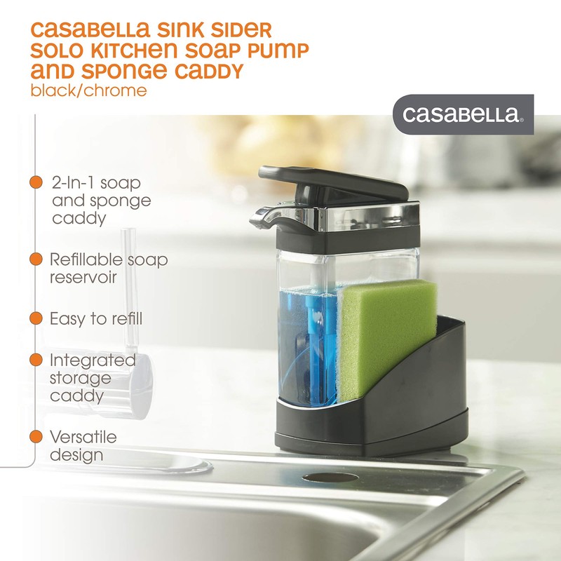 Casabella Sink Sider Solo Kitchen 2-in-1 Soap Pump and Sponge Caddy, Black/Chrome
