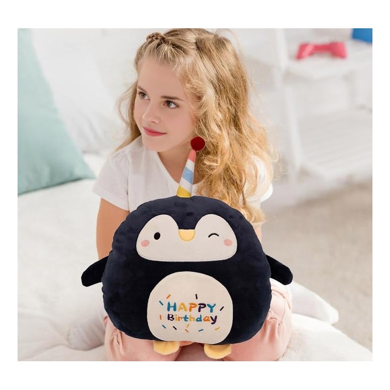 - PERFECT GIFT - Our plush happy birthday Penguin toys are suitable for all ages, from toddlers to adults, perfect for play, collecting & cuddling. Everyone will love this plush pillow for play or as a cute pillow for reading, watching television, studying, and sleepy nap time. It is really comfortable to hold and support your lumbar. Sweet present for Christmas, Valentine's Day,Thanksgiving Day and birthday.