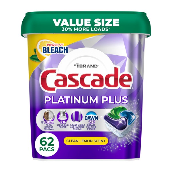 Cascade Platinum Plus Dishwasher Pods, Dish Detergent Soap, Clean Lemon Scent, 62 Count