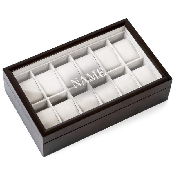 CASE ELEGANCE Monogrammed 12 Slot Espresso Wooden Watch Box Organizer with Glass Display Top