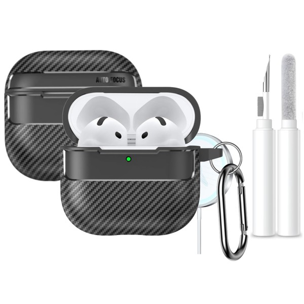 Case for AirPods 4 Case with Cleaner Kit, Compatible with Airpods 4th Generation Full Drop Protection Cover with Keychain Carbon Fibre Style (Cyber Series, Black)