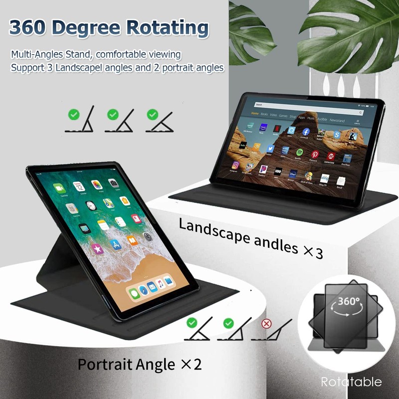 - 【360 DEGREES ROTATIION ADJUSTABLE STAND】Rotating swivel design can go from landscape to vertical modes freely for reading veiwing or typing. Folding folio leather cover with 3 anti-slip grooves can prop up your device stably,multi- angles stand to give you the best visual experience