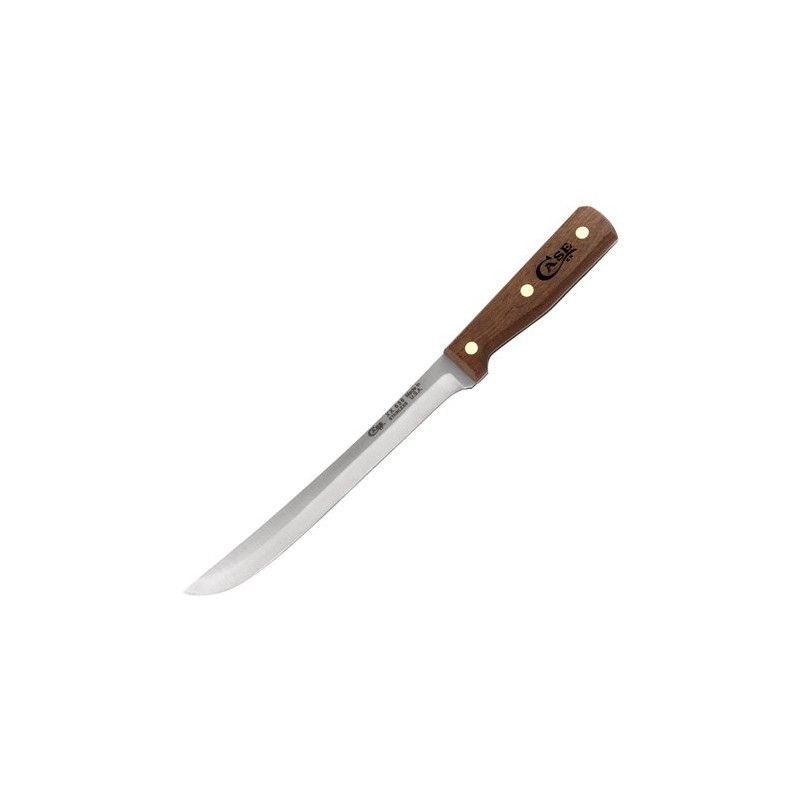 This handsome classic Slicing Knife is part of our Household Cutlery collection. It features a 9-inch stainless steel Slicing blade with a solid walnut handle and a full tang. The Slicing knife is designed to create thin uniform slices of everything from roast meats to smoked fish. This precision knife is proficient at cutting fruits and vegetables as well. This knife make preparing food a breeze. This knife is constructed with Case Tru-sharp stainless steel which is a special high-carbon steel that helps the blades hold an edge longer than conventional steel. It also offers extraordinary blade strength and corrosion resistance. Comes packaged in a clamp pack. Made in Bradford, PA, USA from domestic and imported materials.