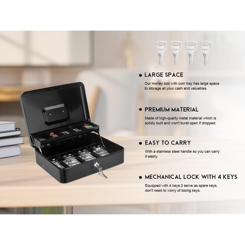 • SECURE CASH BOX: Our cash box with money tray is designed with two tiers, the coin tray has five slots comes over the cashbox when it's opened, below the coin tray is the cash storage area with four slots, along with extra space at the bottom for storing checks, receipts, coin rolls, etc. Making it a well designed lock box to keep your valuables safe and well organzied.