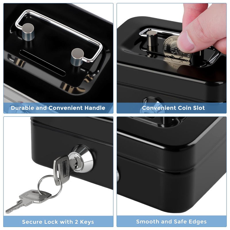 - Durable money box: Steel material is reliable for cash locker, resistant to damage from drops and bumps. This money box is built to last.
