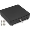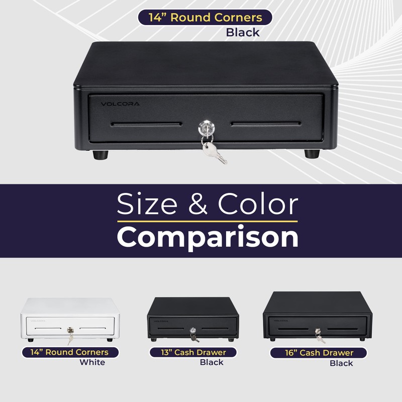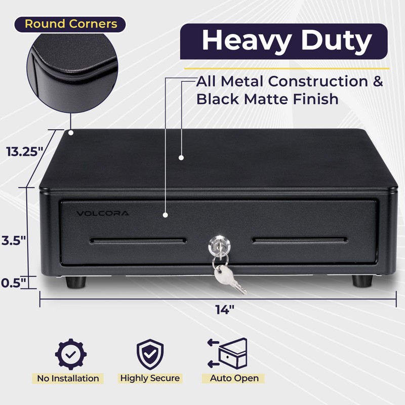 • DURABLE POS CASH DRAWER: Volcora cash register drawer with round corners measures 14"x13.25"x4", Color: black, and Voltage: 24VDC. Our cash drawer has a heavy duty durable metal frame that is an ideal cash register for small businesses and even big establishments too.