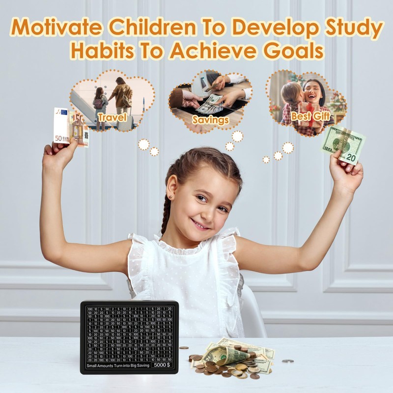 - [CASH BOX WITH 8 TARGETS]:This cash saving box comes with 8 sheets of saving targets, 500,1000, 2000, 3000, , 5000, 10000 and 2 blank sheets for custom savings goals, his innovative box empowers you to personalize your saving journey according to your unique financial objectives.