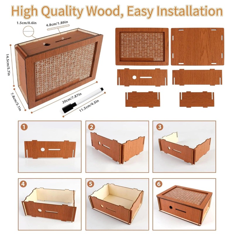 - 【Reach Savings Target】The cash vault wooden savings box money bank helps you reach your financial targets. The panels are printed with numbers, allowing you to mark off the amount you save each time. Simply deposit the specified amount into the box and check it off on your money pot. As each box is ticked off, you're one step closer to reaching your financial milestone.