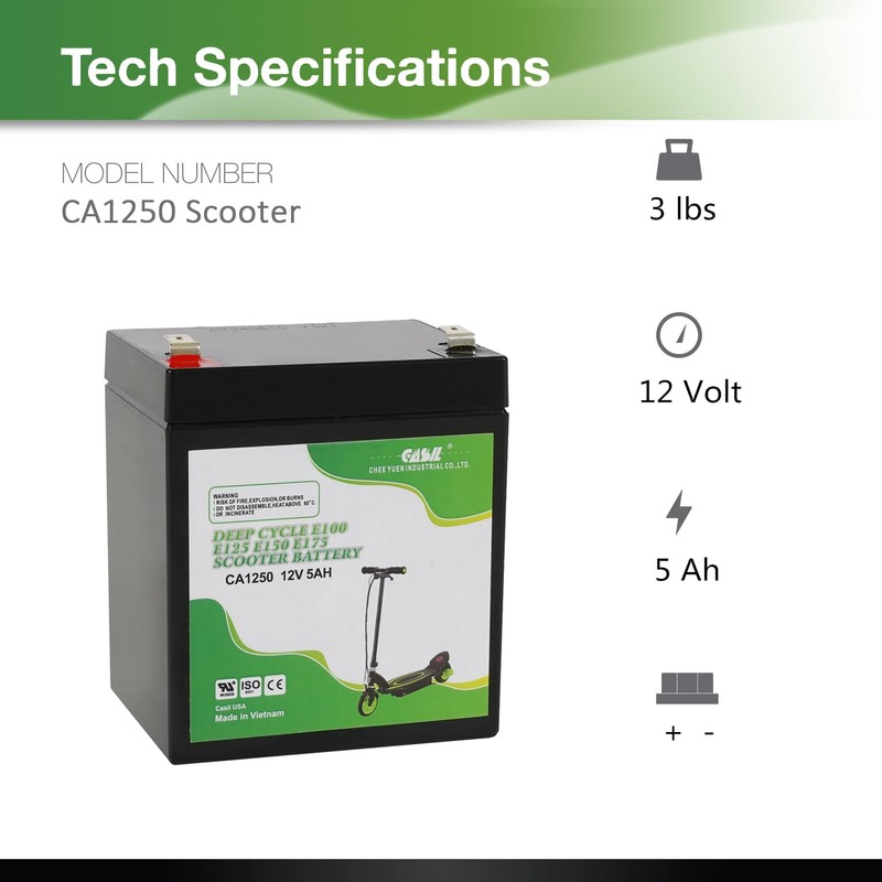 - Durable and Long-Lasting: Our Casil 12V 5Ah Battery is engineered for durability, making it the ideal e100 razor scooter battery. Designed to provide reliable power for your Razor E100, E125, and E175 scooters.