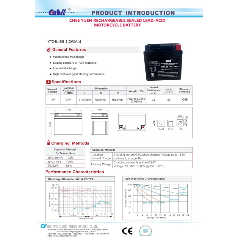 Casil YTX4L-BS 12V 3AH High Performance Rechargeable Sealed Motorcycle Battery