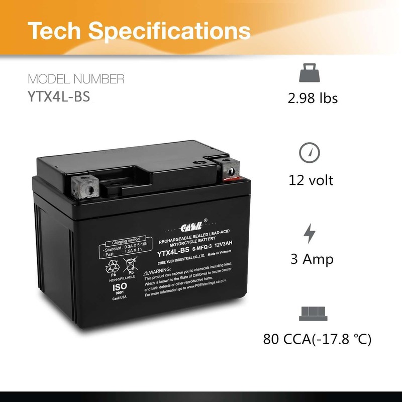 - YTX4L-BS is a 12V 3AH 50 Cold Cranking Amps (CCA) Sealed Lead Acid (SLA) Battery