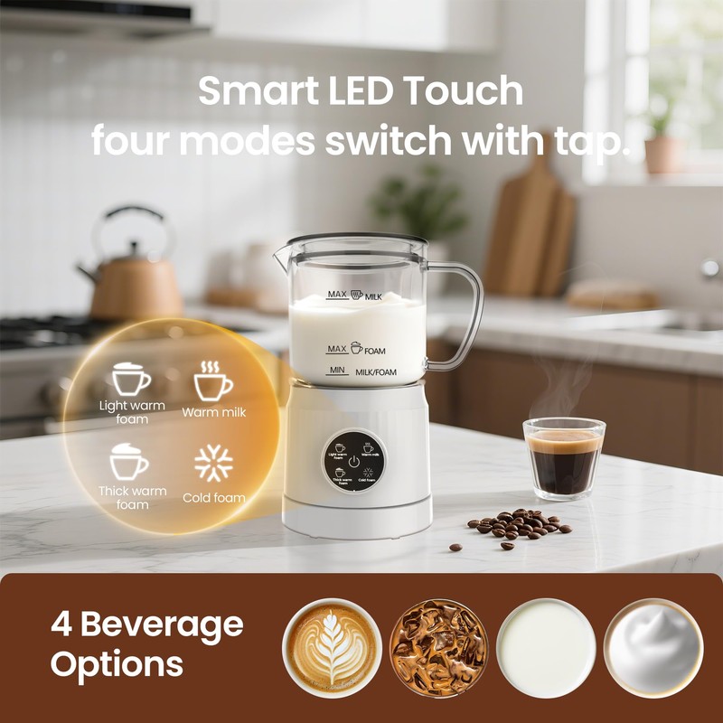 - Coffeehouse Style at Home: Our 4-in-1 milk frother gives you thick, light, cold, or warm foam with a touch of a button