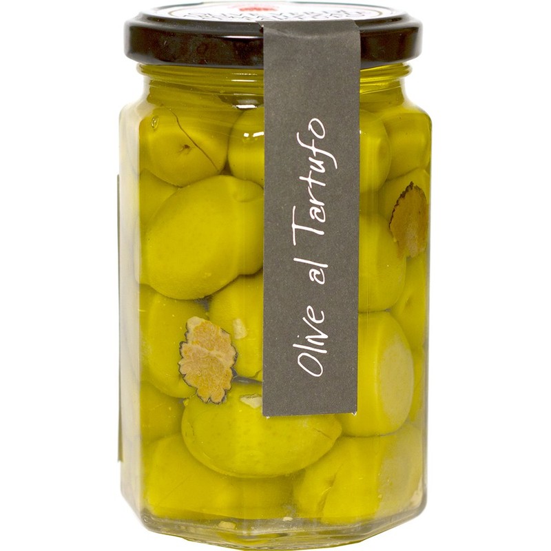 - Green olives in oil with truffle slices.