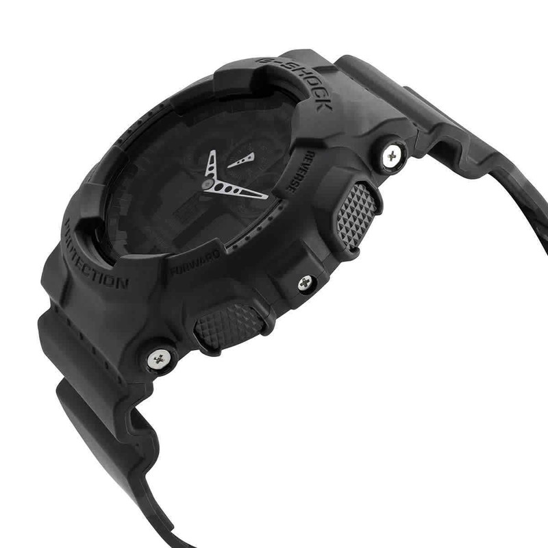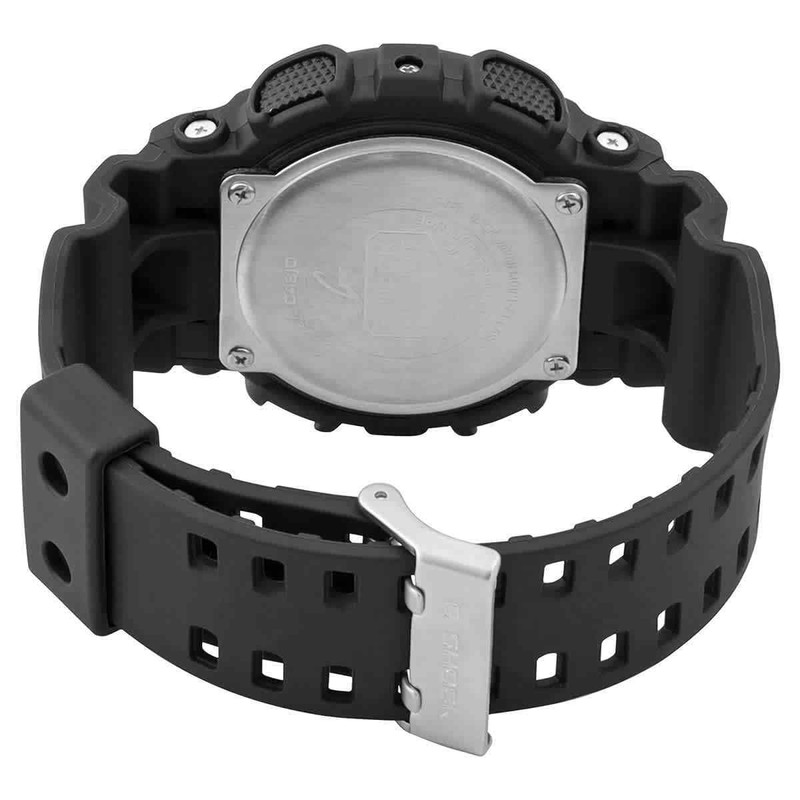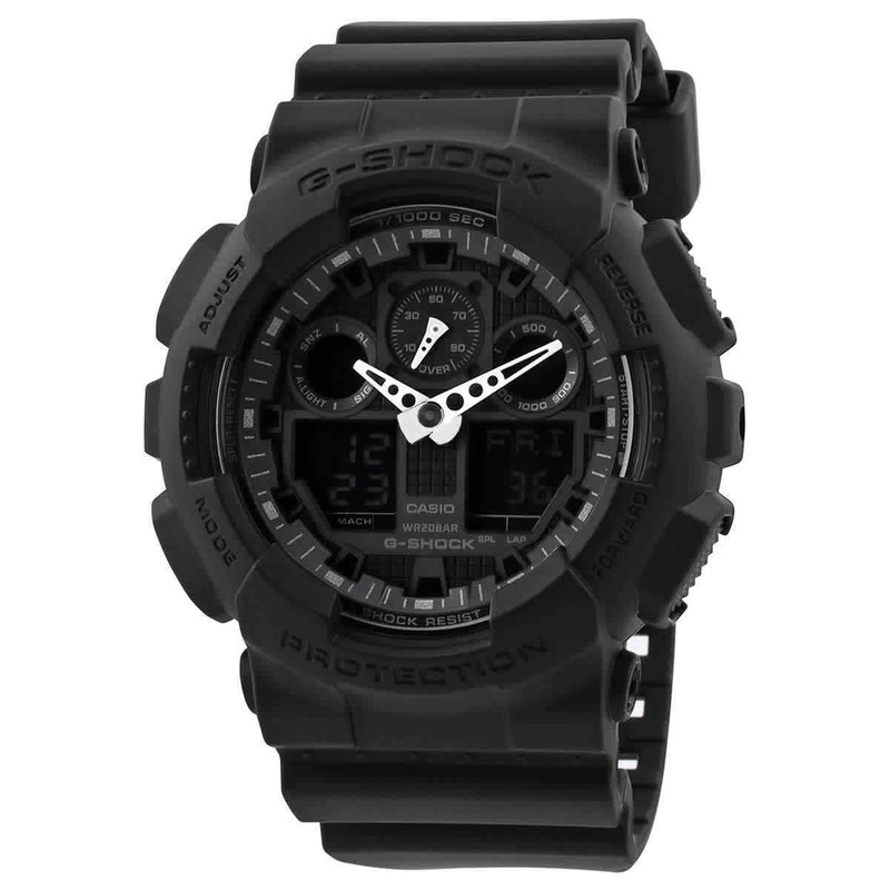Black dial enhanced by silver-tone hands. Black resin case with a black resin band. Quartz movement. 200 meters / 660 feet water resistance. Fixed bezel. Scratch Resistant Mineral crystal. Solid caseback. Tang clasp. Case size 55 x 51.2 mm x 16.9 mm. Band 20 mm x Mens Standardlong. Casio GA100-1A1 G-Shock Watch.