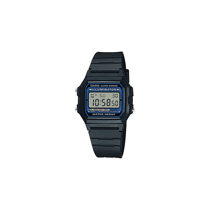 Show off your classic style with the Casio Men's Illuminator Digital Watch #F105W-1A. Protected by a durable mineral dial window, the digital-gray dial face offers at-a-glance readability while a handy day-and-date calendar keeps your schedule on track. Both the 35-millimeter case and stationary bezel are made of high-quality resin. Other details include a matching black resin band that is accompanied by a sturdy buckle closure. This affordable and striking timepiece accentuates your casual cool. It is powered by quartz movement and is water resistant to 300 feet.