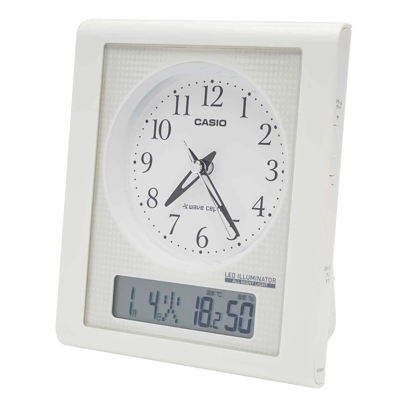 - Features: Radio reception function (automatic reception / manual reception), temperature measurement display, humidity measurement display, calendar display, electronic sound alarm, snooze function, LED light (with steady on function), second hand stop function (with alarm setting)
