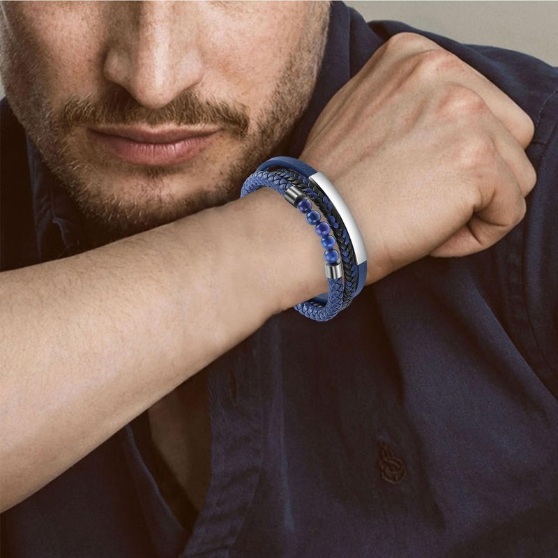 Casisto.J Men's Leather Bracelet Braided Beads Stainless Steel Black Blue with Magnetic Clasp Gift Pack, Stainless Steel