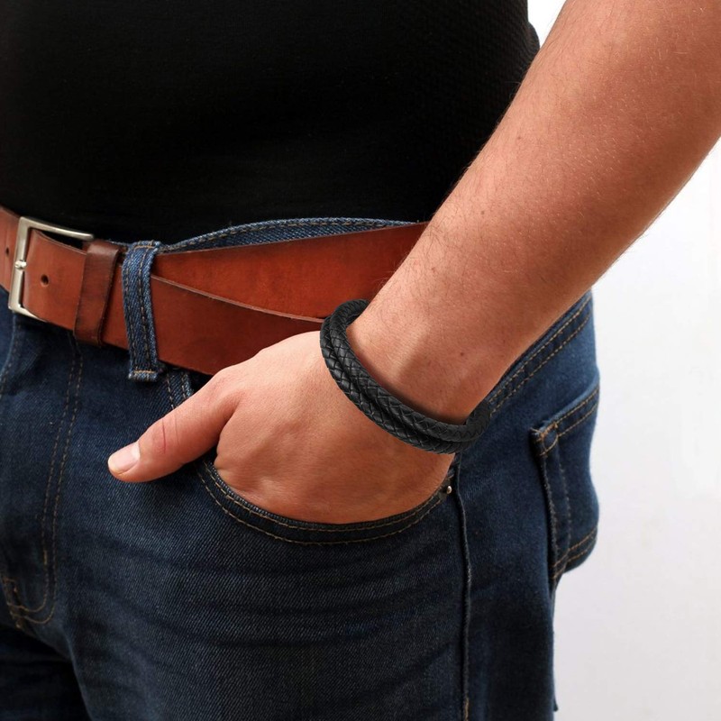 - Material: genuine leather in black or brown and buckle made of 316L stainless steel. Hand-woven leather bracelet for men.