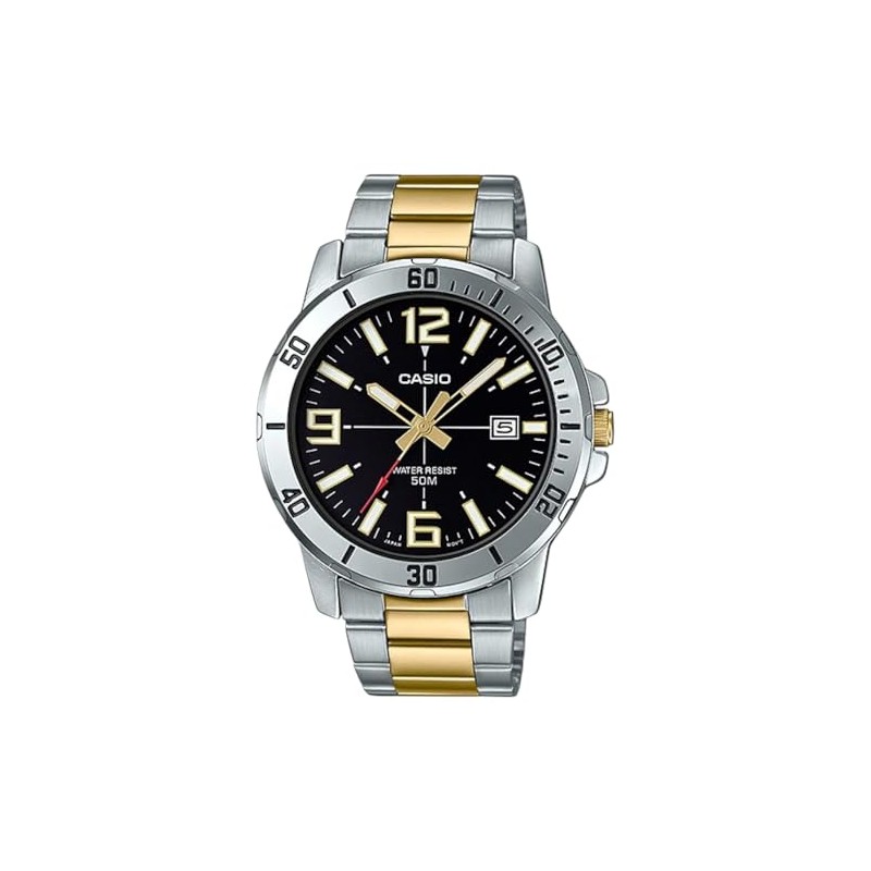 Caso MTP-VD01SG-1BV Reloj deportivo analógico de acero inoxidable de dos tonos para hombre con esfera negra, Plateado, dorado, 49×45×10.3mm, Movimiento de cuarzo