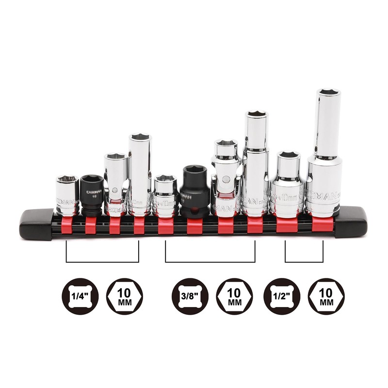 CASOMAN 10-Piece Impact Socket & Flex Socket Set - 10mm, 1/4" & 3/8" & 1/2" Drive, 6-Point, Magnetic Impact Sockets, with Storage Rail