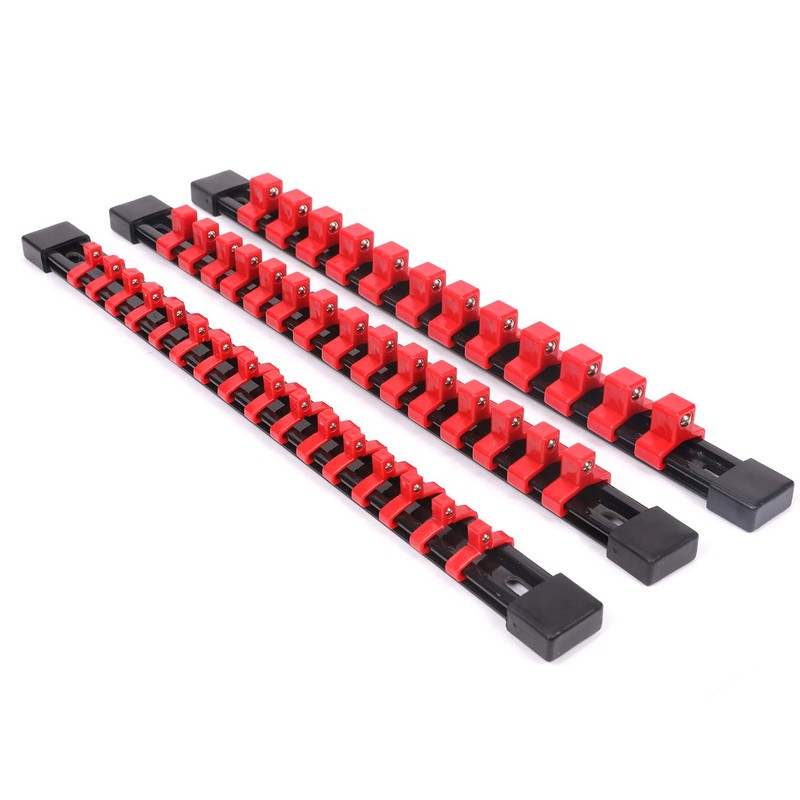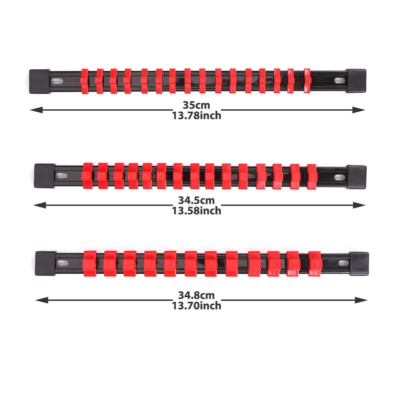 CASOMAN 3 PC Set Socket Organiser, SAE And Metric Socket Holder Rail, 1/4 Inch Drive x 16 Clips, 3/8 Inch Drive x 15 Clips, 1/2 Inch Drive x 12 Clips, Premium Quality Socket Holder (Red)