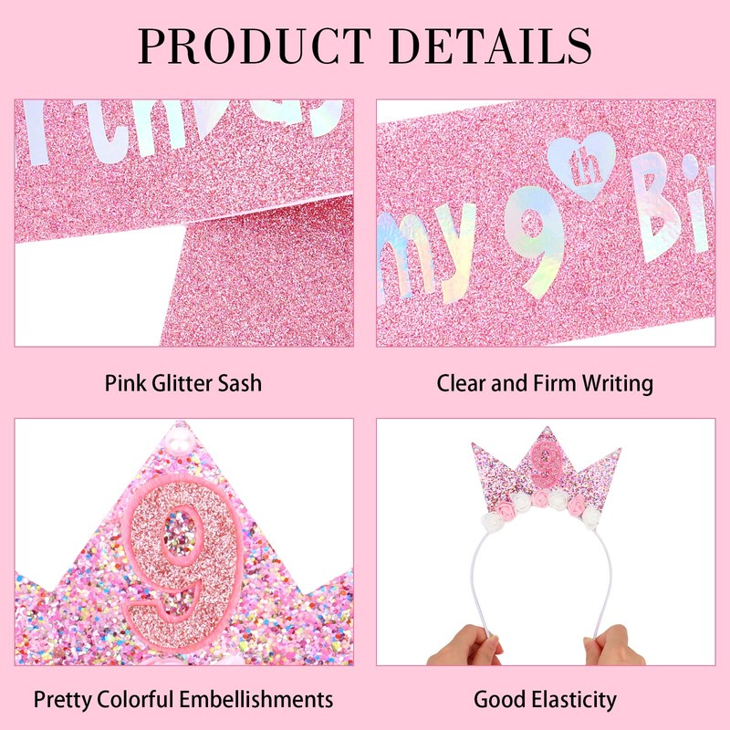 - Celebrate Her 9th Birthday in Style – This adorable birthday girl set includes a glittery crown headband with a number "9" centerpiece and a matching pink sash that says “It’s My 9th Birthday”