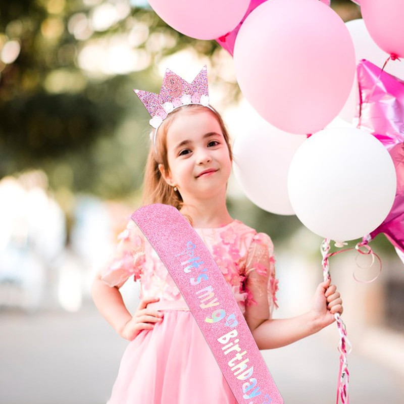 - Celebrate Her 9th Birthday in Style – This adorable birthday girl set includes a glittery crown headband with a number "9" centerpiece and a matching pink sash that says “It’s My 9th Birthday”