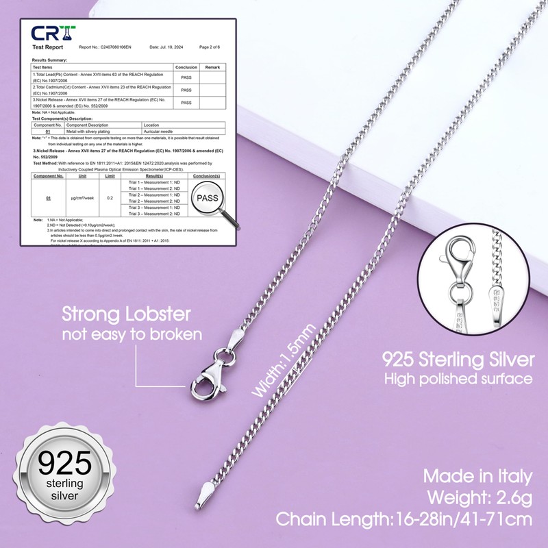 CASSIECA Women's 925 Silver Chain, 925 Silver Chain, Without Pendant, Curb Chain, 1.5 mm Necklace, Silver Chains for Women, Girls, 41-61 cm, Sterling silver