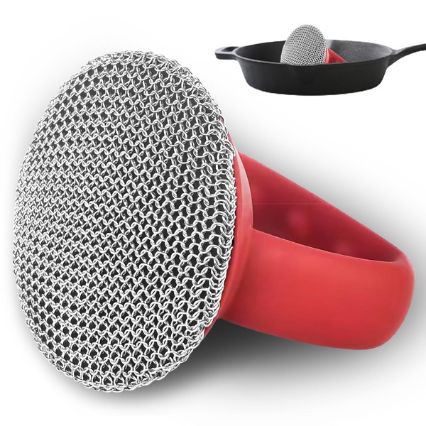 Cast Iron Scrubber with Handle, Upgarded Chainmail Scrubber for Cast Iron Pan...