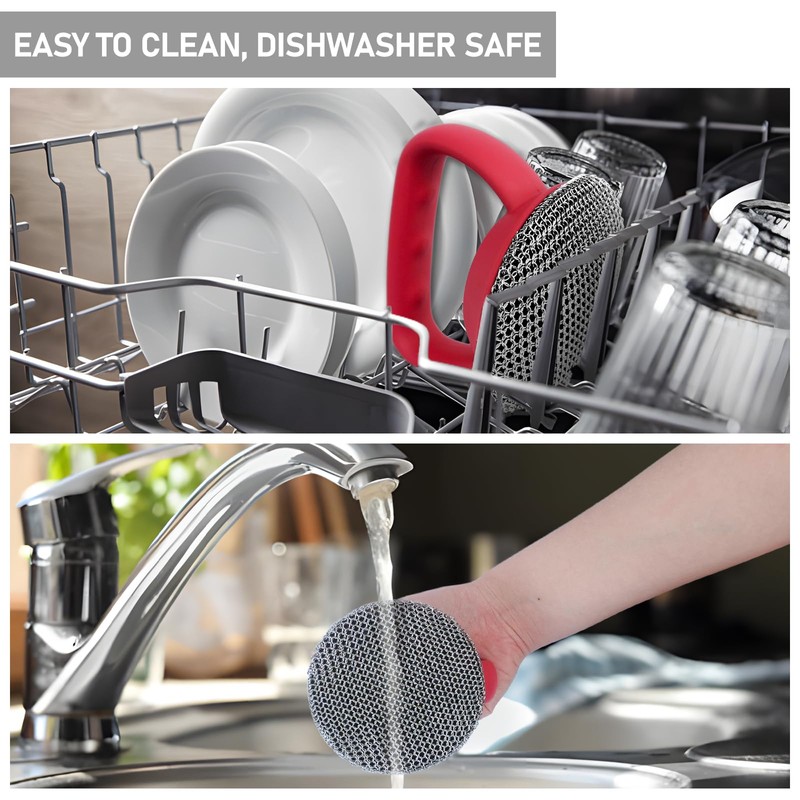 • Durable, Long-Lasting Cast Iron Scrubber – Crafted from premium 316L stainless steel and food-safe silicone, the cast iron chainmail scrubber is rust-resistant and designed to last. Built to endure heavy use, the cast iron skillet cleaner retains its shape and performance, saving you money over time by reducing replacements