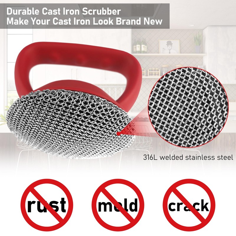 • Enhanced Cleaning with Fine 316L Rings– The cast iron scrubber features finer 316L stainless steel rings for a more thorough clean without scratching or stripping your cookware’s seasoning. The cast iron cleaner is perfect for maintaining cast iron pans, skillets, and griddles with less effort
